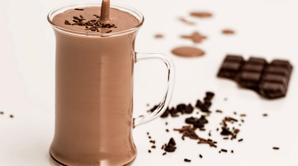 Version café : 30g whey chocolat/vanille, 50g avoine, 1 shot espresso (ou 100ml café froid), 1 banane, 250ml lait, glaçons = caféine 80mg (boost focus + mobilisation graisses) + glucides énergie.